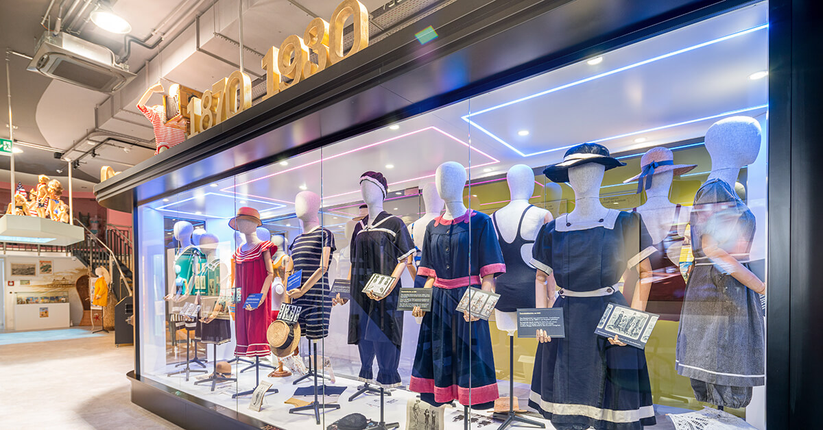 Das älteste Bademodenstück unseres Museums ist ein Badekostüm von 1870. Seitdem hat sich die Bademode komplett verändert. Es gab verschiedene Zwischenstufen, die für die Bademoden-Entwicklung entscheidend waren: