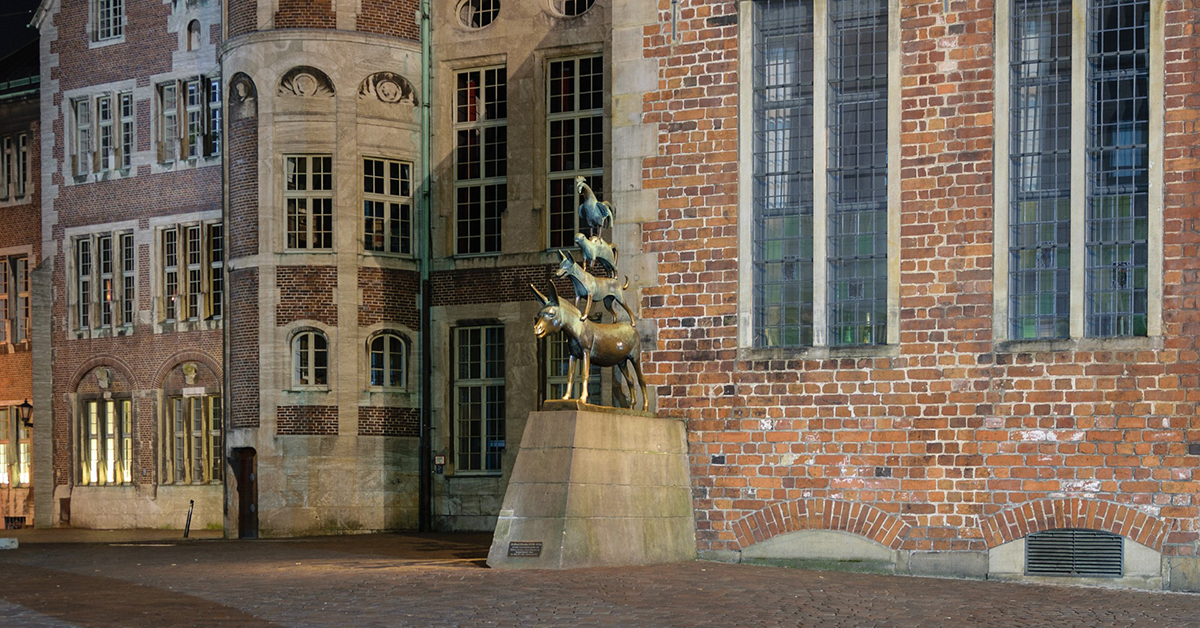Die vier Figuren Hahn, Katze, Hund und Esel stammen ursprünglich aus einem Märchen der Gebrüder Grimm und stehen heute an der Seite des Bremer Rathauses.