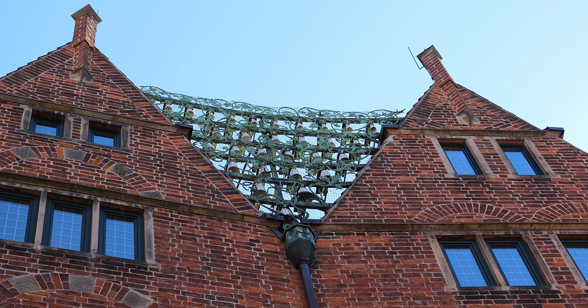Zwischen den Giebeln zweier alter Lagerhäuser hängt ein Glockenspiel aus 30 Meißner Porzellanglocken, welches jeweils zur vollen Stunde eine Melodie spielt.