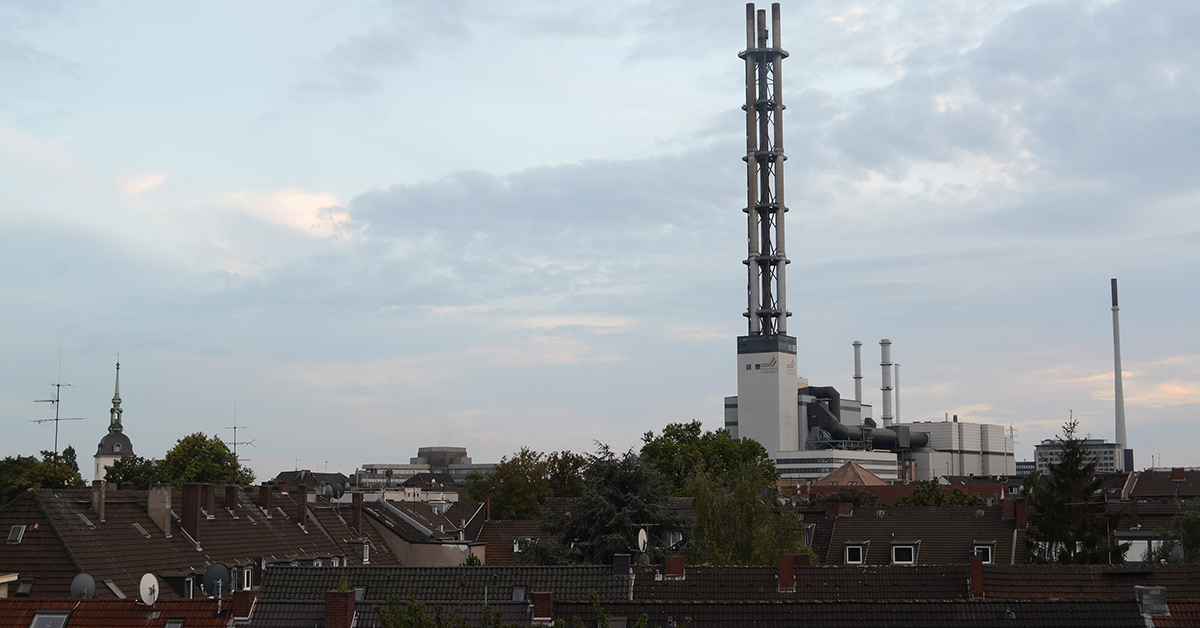 Der Stadtwerketurm am Rande der Duisburger Innenstadt ist ein von weitem sichtbarer Schornsteinturm.
