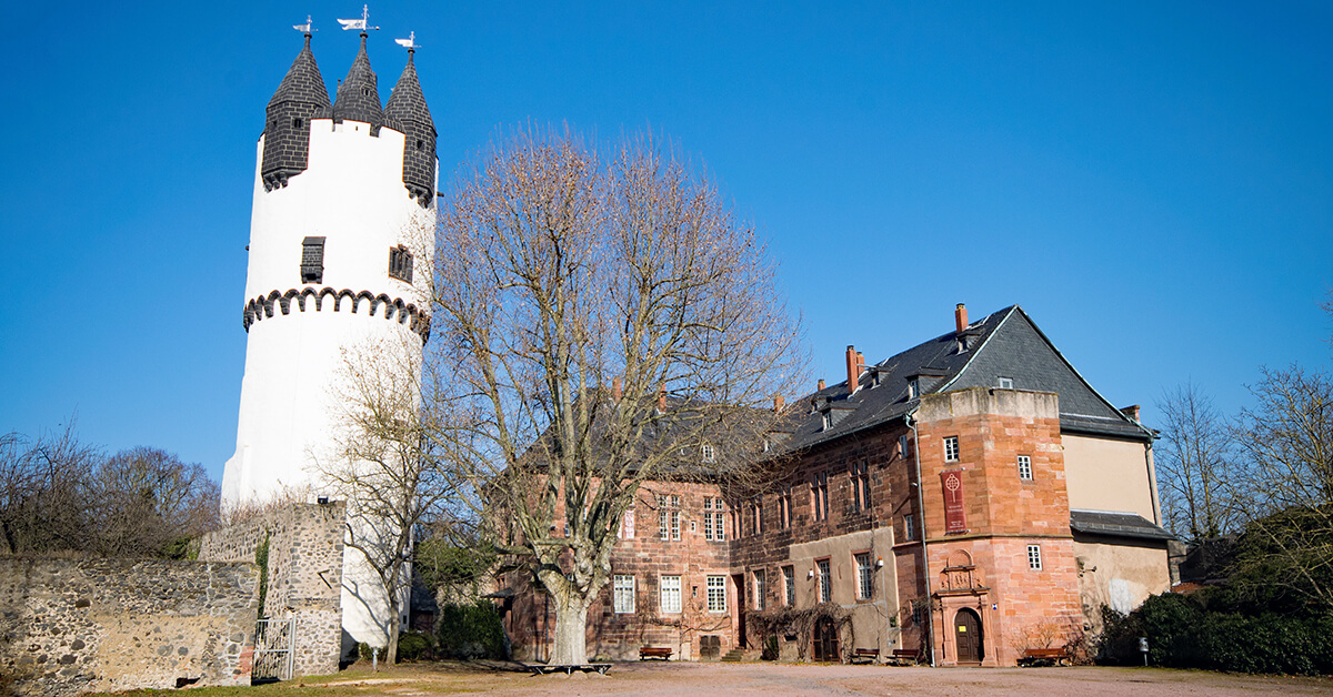 Das Schloss Steinheim in Hanau sticht vor allem durch seinen hohen Turm hervor, der an eine Burg erinnert.