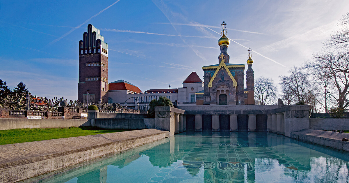 Besonders schön sind beispielsweise die Mathildenhöhe mit dem Hochzeitsturm und das Residenzschloss im Zentrum der Stadt.